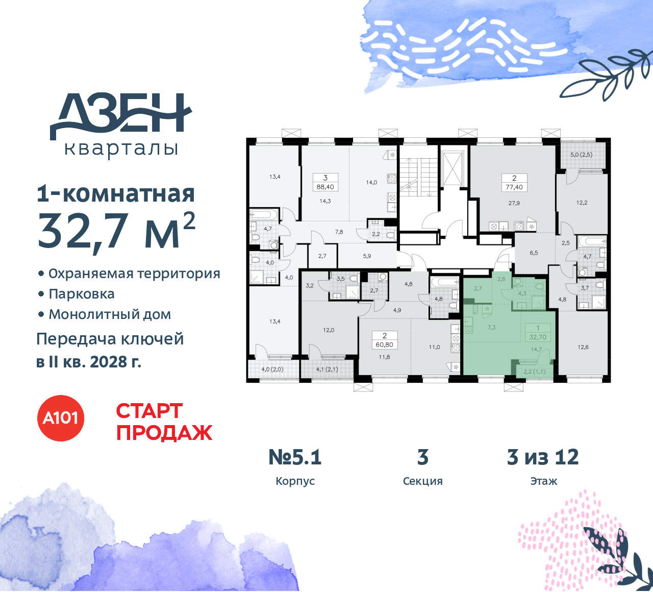 этаж: 3 (всего: 8), кол-во комнат: 1 Срок сдачи: II Квартал 2028 Продается 1-комн. квартира бизнес-класса-студия с отделкой в ЖК "Дзен-кварталы" на 3 этаже. Общая площадь: 32.7 кв.м., площадь гостиной 21.9 кв.м., из которых 7.2 кв.м. выделено под кухонную зону. Все окна выходят на одну сторону. В квартире одна лоджия, один совмещенный санузел. Высота потолков 3.1 м. Имеется ниша под гардероб. Дом монолитный, черырехподъездный, переменной этажности, от 8 до 12 этажей. Квартира находится в 3-й секции высотой 8 этажей в корпусе бизнес-класса 5.1. На этаже 4 квартиры. В подъезде 1 грузовой лифт. Начало строительства - 3 квартал 2025 года. Окончание строительства - 2 квартал 2028 года. Оформление сделки по договору долевого участия. Артикул квартиры по базе застройщика 41К-5.1-85. В шаговой доступности от жилого комплекса находятся станции метро (расстояние по прямой): «Новомосковская (Коммунарка)» (800 м), «Новомосковская» (800 м), «Потапово» (900 м), также недалеко от этого корпуса расположены станции метро: «Коммунарка», «Улица Горчакова», «Бульвар адмирала Ушакова», «Ольховая», «Бунинская аллея». ПРЕДЛОЖЕНИЯ ОТ ЗАСТРОЙЩИКА В ИЮЛЕ 2025: Ипотека от 16,5% для всех! Без удорожания, на весь срок. Купи и копи! Ипотека от 2200 рублей в месяц - до ввода дома в эксплуатацию! "Семейная ипотека" вернулась. Ставка от 3,5% на весь срок! Без удорожания! Выгодное ипотечное комбо: Ипотека от 2200 р./мес. и от 6% после рождения ребёнка! *более подробную информацию по скидкам и акциям уточняйте в отделе продаж Новый район «Дзен-кварталы» возводится на юго-западе столицы – вдоль береговой линии живописного Ивановского пруда и реки Варварки. В основе проекта – «сочетание несочетаемого», гармония простого и утончённого, природного и урбанистического – стиль Japandi, объединяющий скандинавскую функциональность и восточную созерцательность. В приятном соседстве с домами нового района живописный Ивановский пруд — его береговая линия проходит по территории «Дзен-кварталов». Здесь будет благоустроена набережная для отдыха жителей нового района — по авторскому проекту Группы компаний «А101». На территории района появятся два детских сада и крупный образовательный комплекс, в состав которого войдут детский сад и школа. Все они будут спроектированы на основе собственной концепции образовательной среды ГК «А101», разработанной экспертами в области педагогики, детский психологии и эргономики учебных пространств. Фасадные решения выполнены в современном архитектурном стиле, основанном на сочетании японского минимализма и скандинавской функциональности. Использованы природные оттенки спокойного японского пейзажа, материалы, имитирующие натуральные поверхности – штукатурка, облицовочная плитка разных размеров и текстур. Подобный стилистический подход делает пространство созерцательными и гармоничным. Для комфортного хранения габаритных и сезонных вещей на уровне подземного этажа спланированы удобные кладовые помещения. Доступ в них осуществляется на лифте. Отличная транспортная доступность. 2 станции метро, "Коммунарка" и "Потапово" в минутной шаговой доступности. Обстановки общественного транспорт, транспортные развязки и удобный выезд на трассу Солнцево – Бутово – Варшавское шоссе. (AQID02501989)